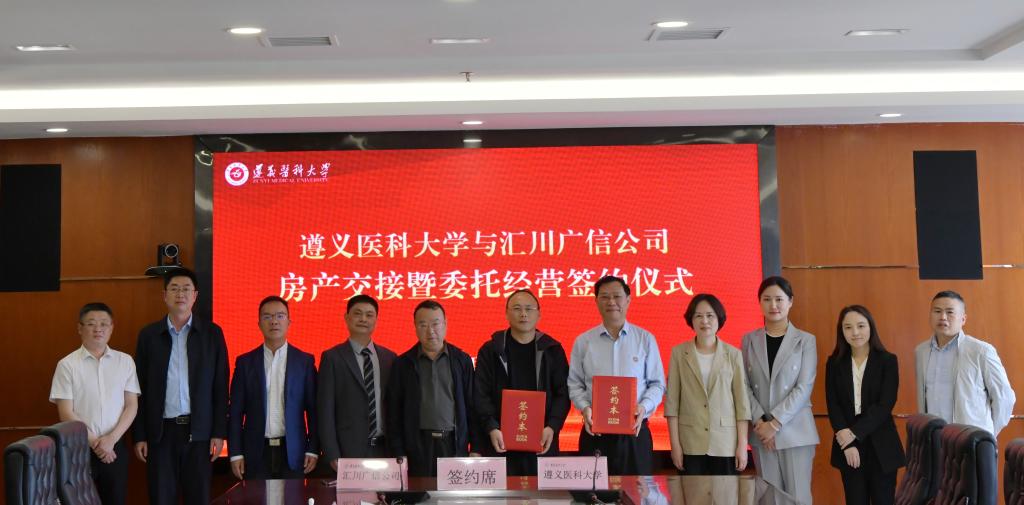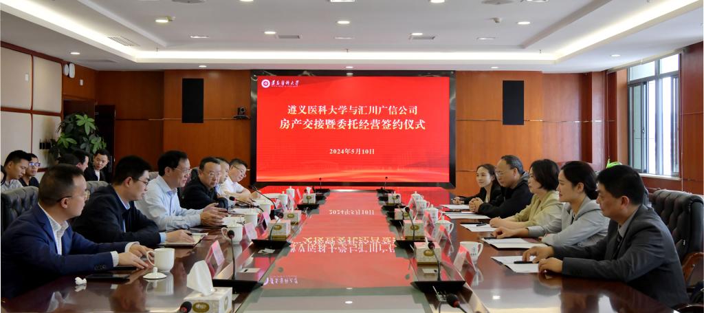 5月10日下午,遵义医科大学与汇川广信房地产开发有限责任公司房产交接暨委托经营签约仪式在行政楼五楼二号会议室举行。汇川广信房地产开发有限责任公司负责人刘晓波,副总经理何志才,学校党委副书记、校长刘建国,作为双方签约代表出席并签署协议。遵义市中级人民法院执行一庭副庭长、执行员、贵州与之律师事务所律师等嘉宾,与学校办公室、财务处、审计处、国有资产管理处等相关部门负责人现场共同见证。签约仪式由学校党委委员、副校长赵继锋主持。
