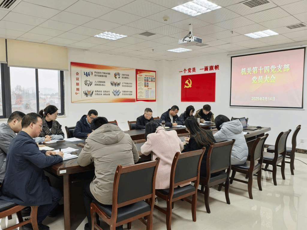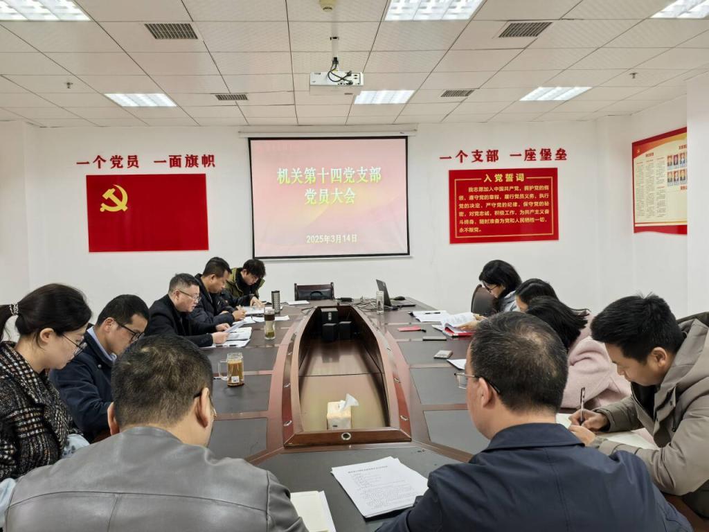 3月14日下午,机关第十四党支部在行政楼501党员活动室召开党员大会。会议由党支部书记罗世强同志主持,全体党员及入党积极分子参加。