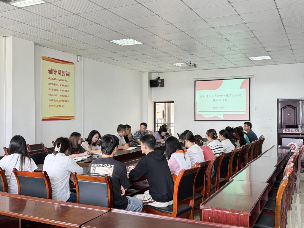 10月14日,贵州遵医资产经营有限责任公司师生座谈会在学生中心305会议室举行,学生工作部(处)长刘承亮、贵州遵医资产经营有限责任公司负责人何阳以及辅导员代表、学生代表参加座谈。
